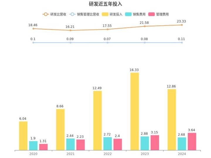 近五年,紫光国微研发投入超过销售和管理费用,近五年研发投入为56.38亿,研发占营业收入比率从2020年的18.46%提升到2024年23.33%%。