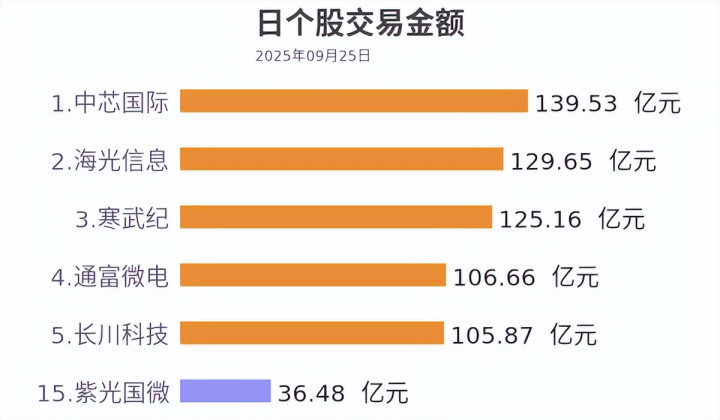 根据日个股交易金额排序,紫光国微的日个股交易金额为36.48亿元,在半导体行业中,排名第15,排名前三位的分别是:中芯国际,海光信息,寒武纪。