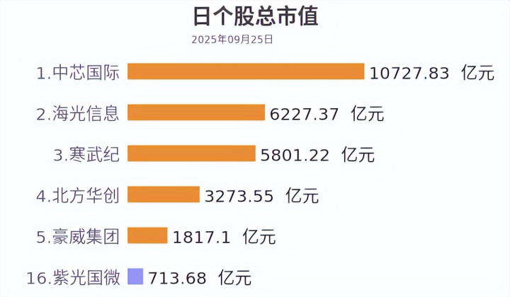 根据市值排序,紫光国微的市值为713.68亿元,在半导体行业中,排名第16,排名前三位的分别是:中芯国际,海光信息,寒武纪。