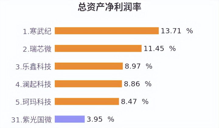 根据总资产净利润率排序,紫光国微的总资产净利润率为3.95%,在半导体行业中,排名第31,排名前三位的分别是:寒武纪,瑞芯微,乐鑫科技。