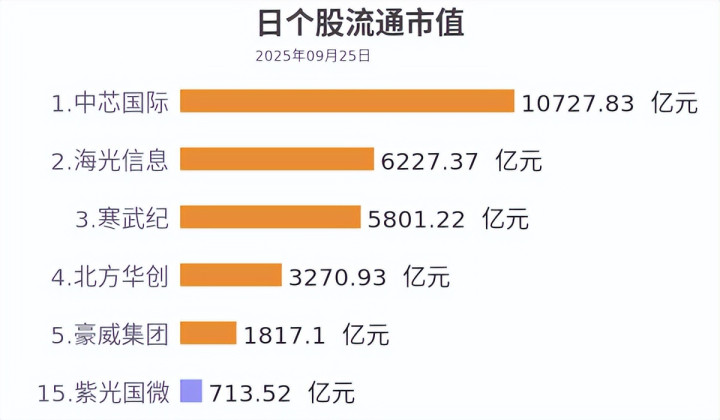 根据日个股流通市值排序,紫光国微的日个股流通市值为713.52亿元,在半导体行业中,排名第15,排名前三位的分别是:中芯国际,海光信息,寒武纪。